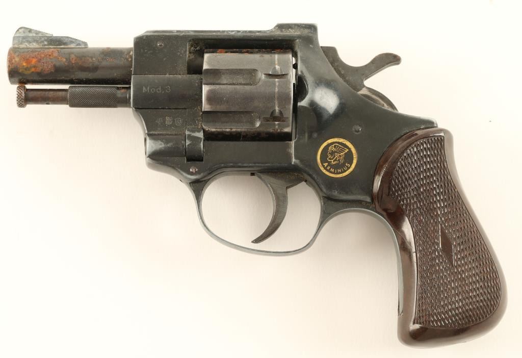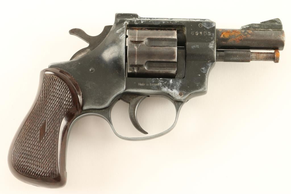 German made double-action snub nose revolver chambered in .32 Smith & Wesson Long. Features a black finish, 2 3/4" barrel, ramped front sight, fixed rear window sight, serrated flat top frame, fluted seven shot cylinder, serrated trigger & hammer spur, and two piece checkered faux wood birds head grips. Revolver shows scattered surface rust, high point edge wear and a white residue. Action performs well, bore is excellent - then turns to rust 1/2" from the muzzle and grips are fine. Condition is fair. ***Modern Firearm***