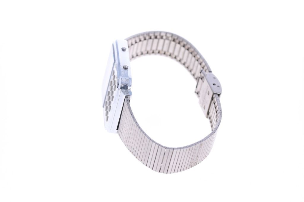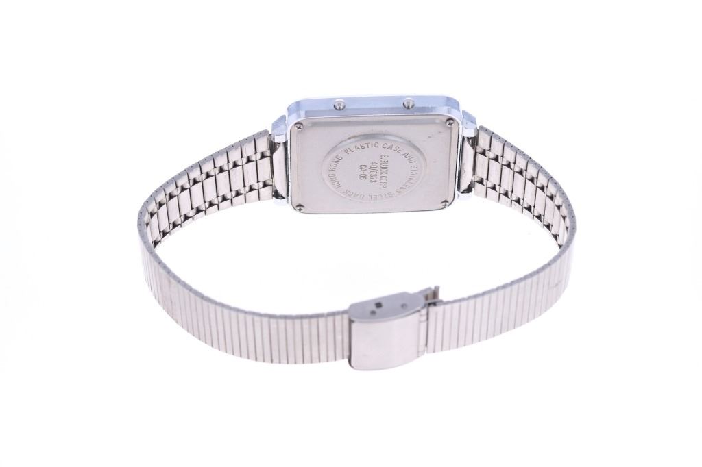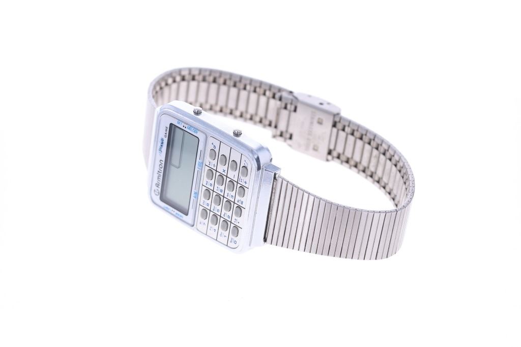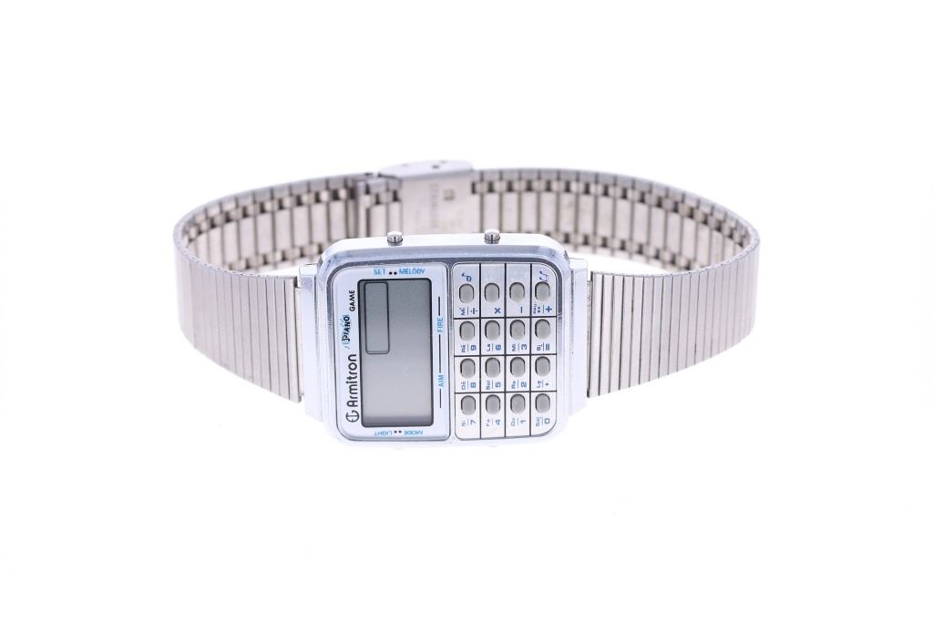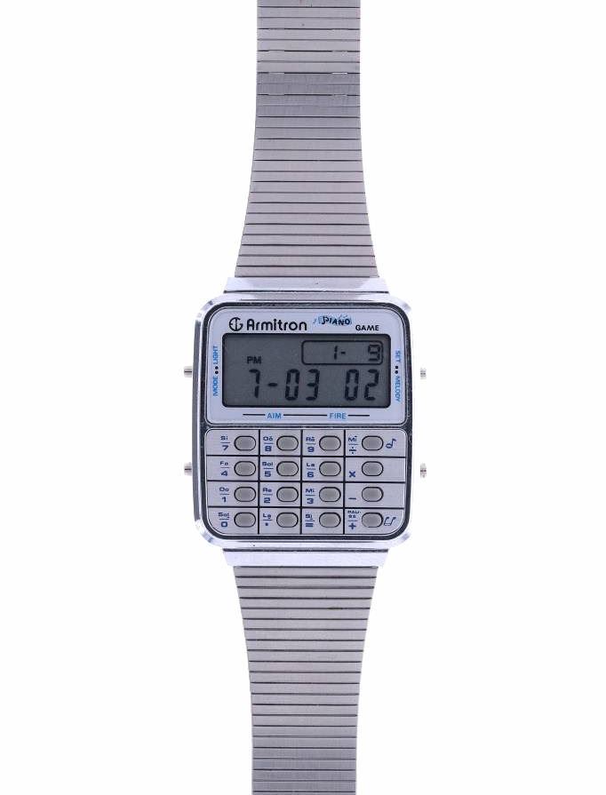Featured in this lot is this Armitron "Piano Game," chrono calculator watch circa 1980's. A battery has been added and the watch appears to work. The watch features a wonderfully and professionally crafted plastic case and stainless steel construction. The watch shows an analog screen and shows a section of buttons that are numbered and used to calculate equations. The condition of this Armitron watch is good with no obvious signs of damage although the batteries are dead the watch shows good overall condition. The measurements of this watch is 2 3/4" x 2 5/8" x 1 1/4".