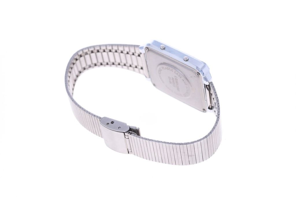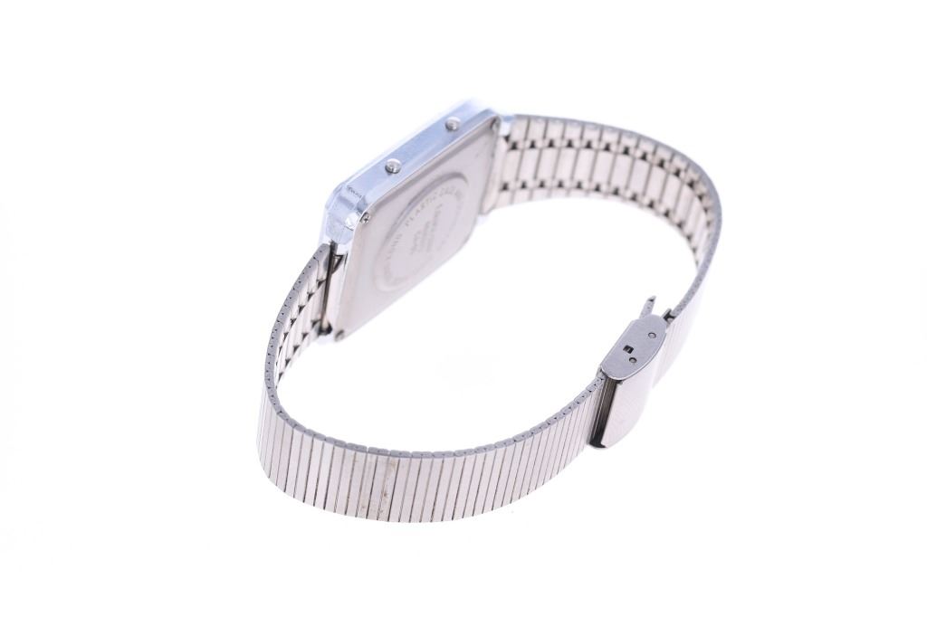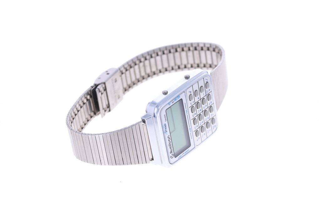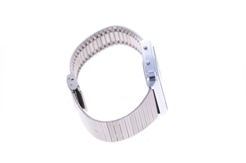 Featured in this lot is this Armitron "Piano Game," chrono calculator watch circa 1980's. A battery has been added and the watch appears to work. The watch features a wonderfully and professionally crafted plastic case and stainless steel construction. The watch shows an analog screen and shows a section of buttons that are numbered and used to calculate equations. The condition of this Armitron watch is good with no obvious signs of damage although the batteries are dead the watch shows good overall condition. The measurements of this watch is 2 3/4" x 2 5/8" x 1 1/4".