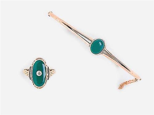 14 K gold, thin openable bangle, chrysoprase decoration, ring with 1 brilliant, circa 1920, marked, weight: 16.2 g, diameter: 16.0 mm, worn.