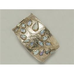 14 K white gold, wide detachable armlet, engraved and applied foliated scroll motif in the middle part, 17 drop shape opal decoration, modern, marked, weight: 48.0 g, unique jewel.