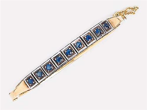 14 K gold, openable armlet, in the middle there are 9 care set sapphires 1.37 ct, marked, PV maker’s mark, weight: 18.3 g, in good condition.