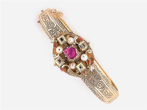 Antique gold, sliding clasp, engraved by hand, at the middle part there is an applied part of a jewel from the 18th century, 4 closed set table cut diamonds, real pearl, ruby and the rest of enamel, the armlet is from the 19th century, marked, weight: 23.