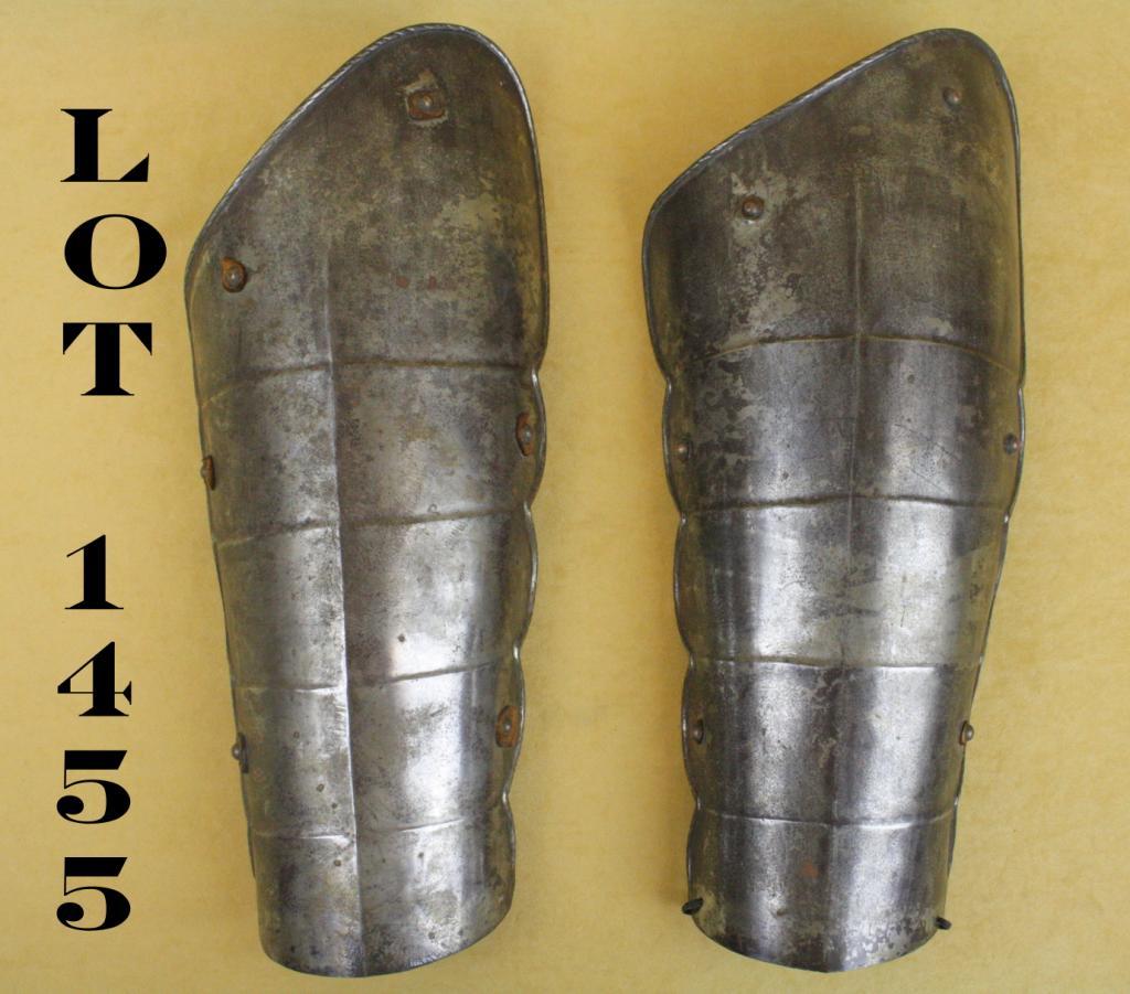 Armor display of two pieces approx. 17” x 7” each and appear to be upper leg covers, age unknown but some wear and dark patina. Est.: $50-$100.
