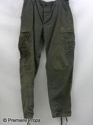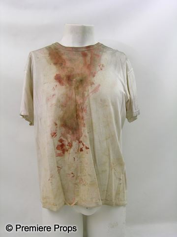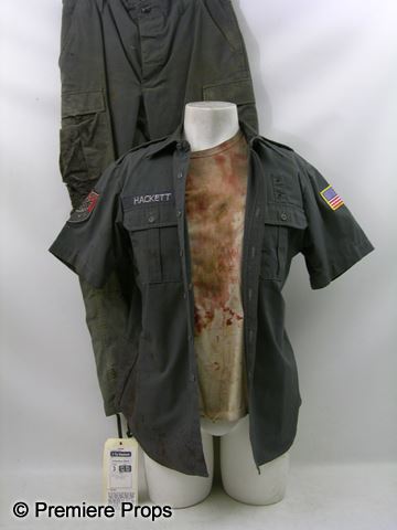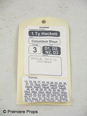 Ty Hackett (Columbus Short) screen worn white "Calvin Klein" crew neck short sleeve t-shirt, (Size L) dark gray "Propper" short sleeve button down uniform shirt with "Eagle Shield" patch on the right arm and American Flag patch on the left arm with "HACKETT" name patch on the right chest, (Size M) and dark gray "Propper" cargo pants with button fly. (Size M) Includes wardrobe tag! This costume is very bloody on all parts and the pants are dirty and torn at the knee.