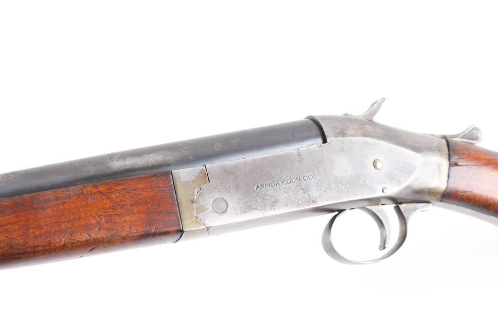 Vintage single shot break top shotgun. Accepts 2-3/4" shells. Features blued finish, 32" barrel, brass bead front sight, Full choke, exposed hammer, top lever opening, smooth wood forend and semi-pistol grip stock. Bore is very good condition. Retains 60% finish, fading and thinning, with small patina spots throughout. Receiver is a mottled brown patina color. Wood is good condition, varnished, with scrapes and dents, repair to left side of butt stock in tang area, also a crack in the same area. Buttplate has a thin wide chip out near the heel.
