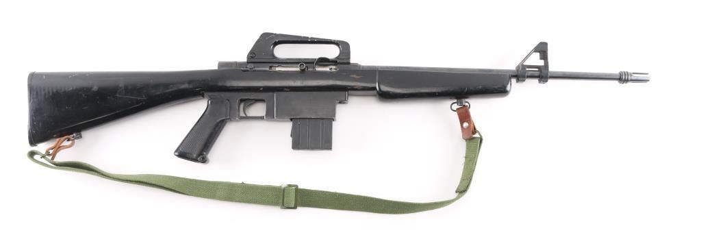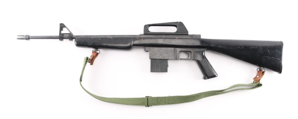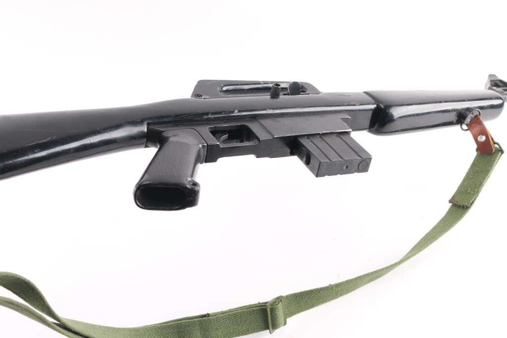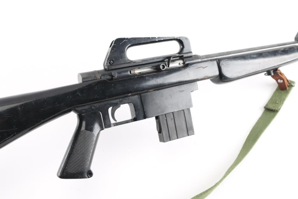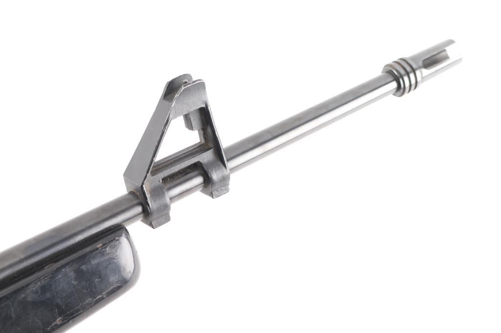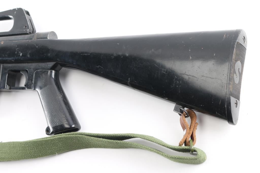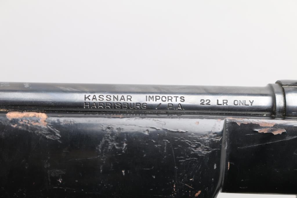 .22 Lr Sn: 1003568 Semiautomatic rifle made in the Phillipine Islands to appear very similar to AR15/M-16 type rifles, imported by Kassnar Imports, Harrisburg PA. Features a wood stock painted black, pistol grip, carry handle, prong style flash suppressor, triangular front sight base, sling swivels, approx 17.5 inch barrel. Magazine is mounted in a larger aluminum block to match the general appearance of a 20 round AR magazine, holds 10 rounds. Shell deflector. Bore is excellent/bright. Retains 80% finish with bare metal at sharp edges and sides of sight bases. Includes magazine and green canvass sling.