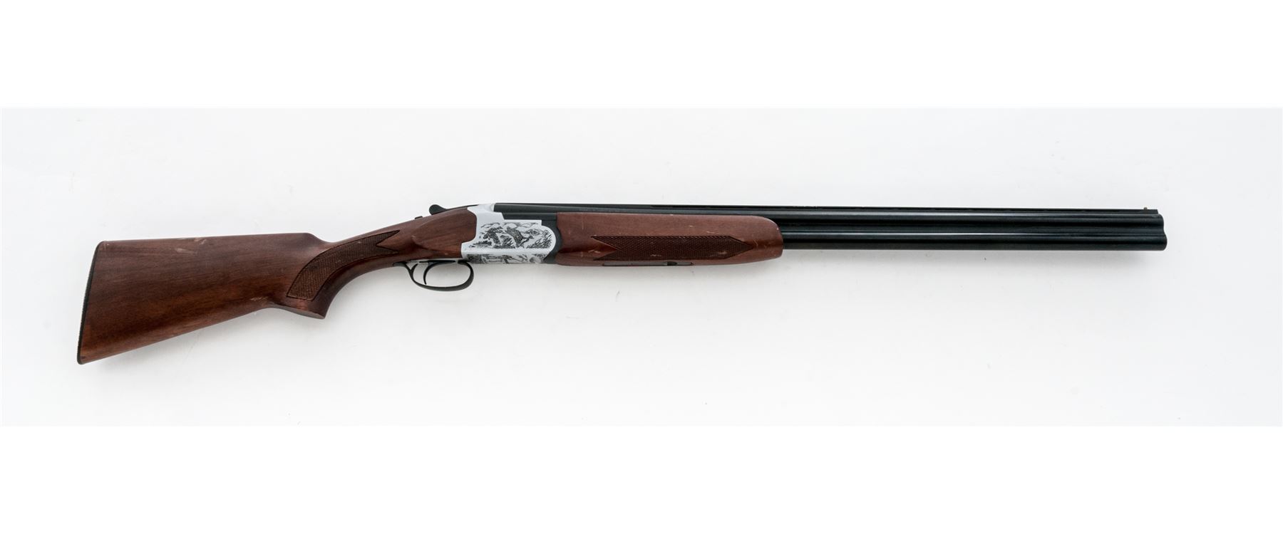 Armsport Model 2802 Field Grade Over/Under Shotgun, #121061. 12 ga. 28'' vent rib barrels have 3'' chambers and are choked Mod./Full. Boxlock action features single selective trigger, non-auto safety and extractors. Satin-finish receiver is roll engraved with several hunting and shooting scenes. Mfg'd in Turkey by Sarsilmaz in the 1990s. Condition is good, but suffers from numerous rough handling marks on wood. Action appears to function correctly, bores are good. Est.: $300-$400. (Modern)