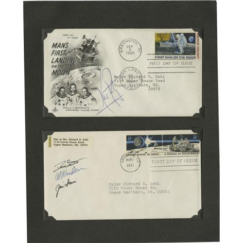 <B>Armstrong signed Moon Landing First Day Covers</B></I> A very desirable Apollo II envelope, postmarked the day of the Sept 9, 1969 Moonlanding, and boldly autographed in blue ink by Neil Armstrong. Also, another postmarked August 2, 1971, signed by Dave Scott, Jim Irwin, and Al Worden. These three composed the backup crew for Apollo 12, and were the primary crew for Apollo 15. Each measures 6.5" x 3.5" and are in extra fine condition.