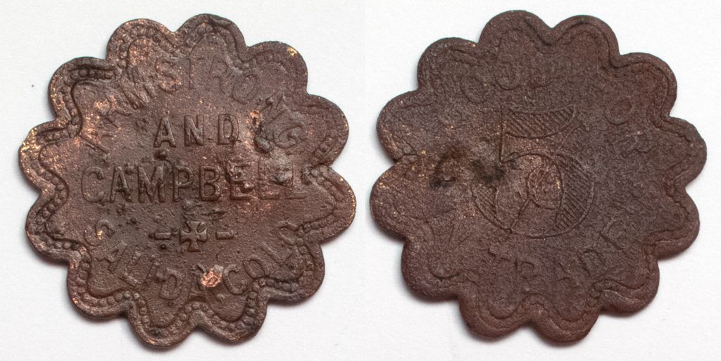 Nice Scalloped Armstrong & Campbell bar and billiards token from Colorado. Armstrong & Campbell / Salida, Colo // GF 5c IT. Fair condition but easily readable!City: SalidaCounty: ChaffeeState: CoDate: