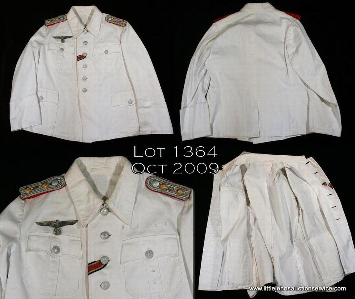 Army Artillery Hauptmann White Summer Service Tunic. The tunic is an approx. size 36, and is a light weight, white cotton construction tunic with a pique weave. It features a vertical, six button front closure with dual, brass hooks and eyespositioned at the forward neckline and a lay down collar. The tunic has four, pleated, patch, front pockets with scalloped button down flaps. The right breast has two small, vertical and one horizontal thread loops for securing a removable,national breast eagle. The tunic comes with a removable, silver washed, die stamped, alloy construction national breast eagle with out-stretched wings clutching a wreathed, canted, swastika in it's talons. The eagle's wingspan isapprox. 3 5/8" across. The silver wash is approx. 60% with wear to the flat matte grey of the base alloy. The left breast features one set of award loops on the breast pocket, and six loops above the pocker for an approx. eight to ten placeribbon bar. The third button hole features an EK II ribbon, which is stitched through the hole. The reverse of the tunic has a vertical, tail skirt vent. The straight cut, non-adjustable sleeves have deep, folded back, French cuffs which are