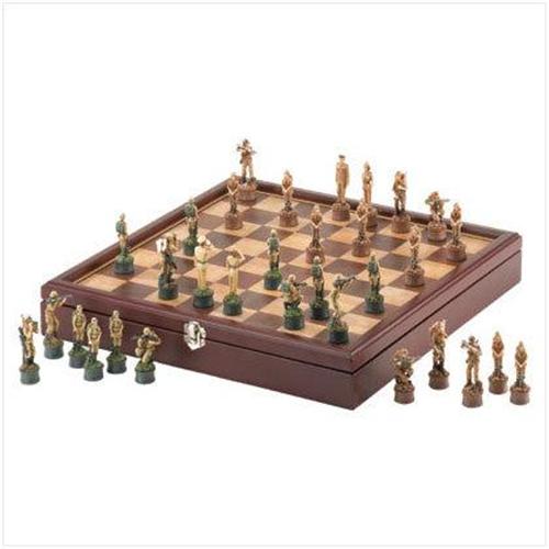 Strategize, scheme and plan your attack in the historical style of the great World War generals! Clever "soldier" pieces are wonderfully authentic, right down to their khakis and packs. Includes pieces and board. Polyresin. Each piece is approx. 3"