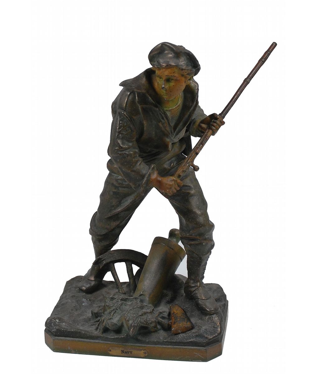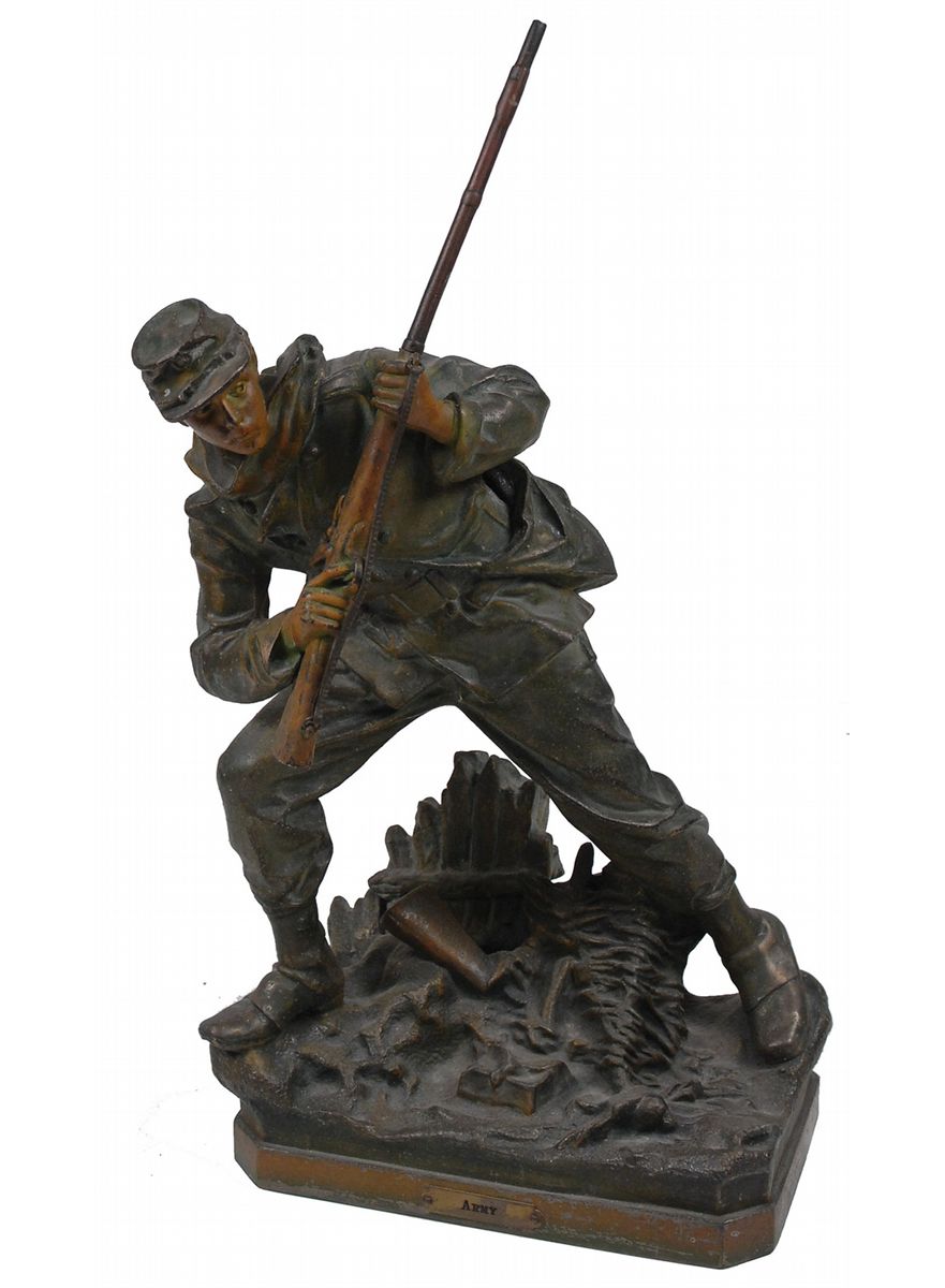 A pair of Army and Navy statues, circa 1890, unmarked, but attributed to Bradley and Hubbard Mfg. Co., Connecticut. Each statue measures approximatelty 12.5? tall with engraved brass plaques at the bottom of each rectangular place reading, “Army,” and “Navy.” Each is a young soldier in either an army or navy uniform, each brandishing a rifle. Each barrel end is threaded and detachable for storage. In very good condition, with most of the bronze finish gone, with some remaining on hands and faces of soldiers, and a broken buttstock to the sailor’s rifle.