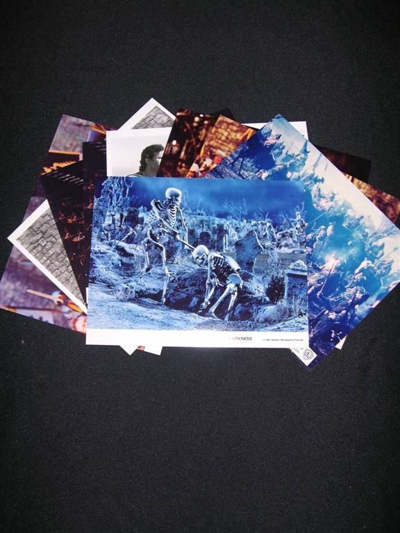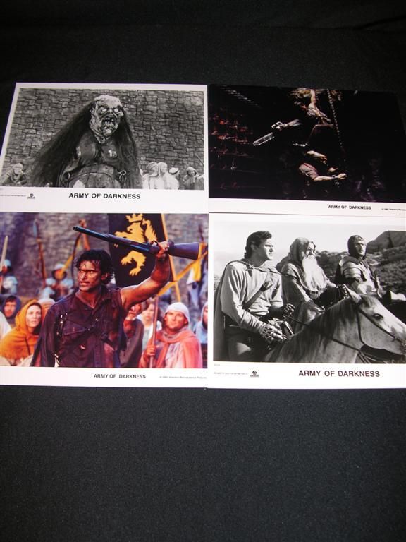 Collection of international lobby cards for Sam Raimi's Army of Darkness. Nine cards in all. Two are stamped on back with a Singapore censor board emblem. The cards depict a variety of scenes with star Bruce Campbell and other performers.