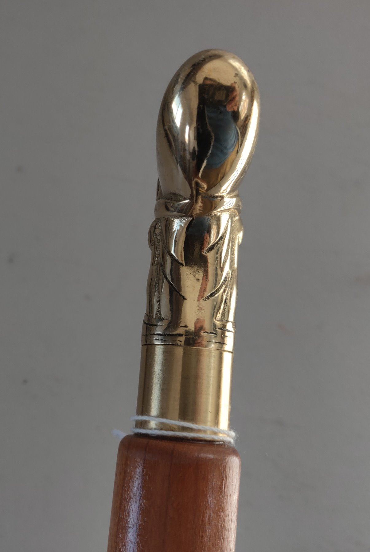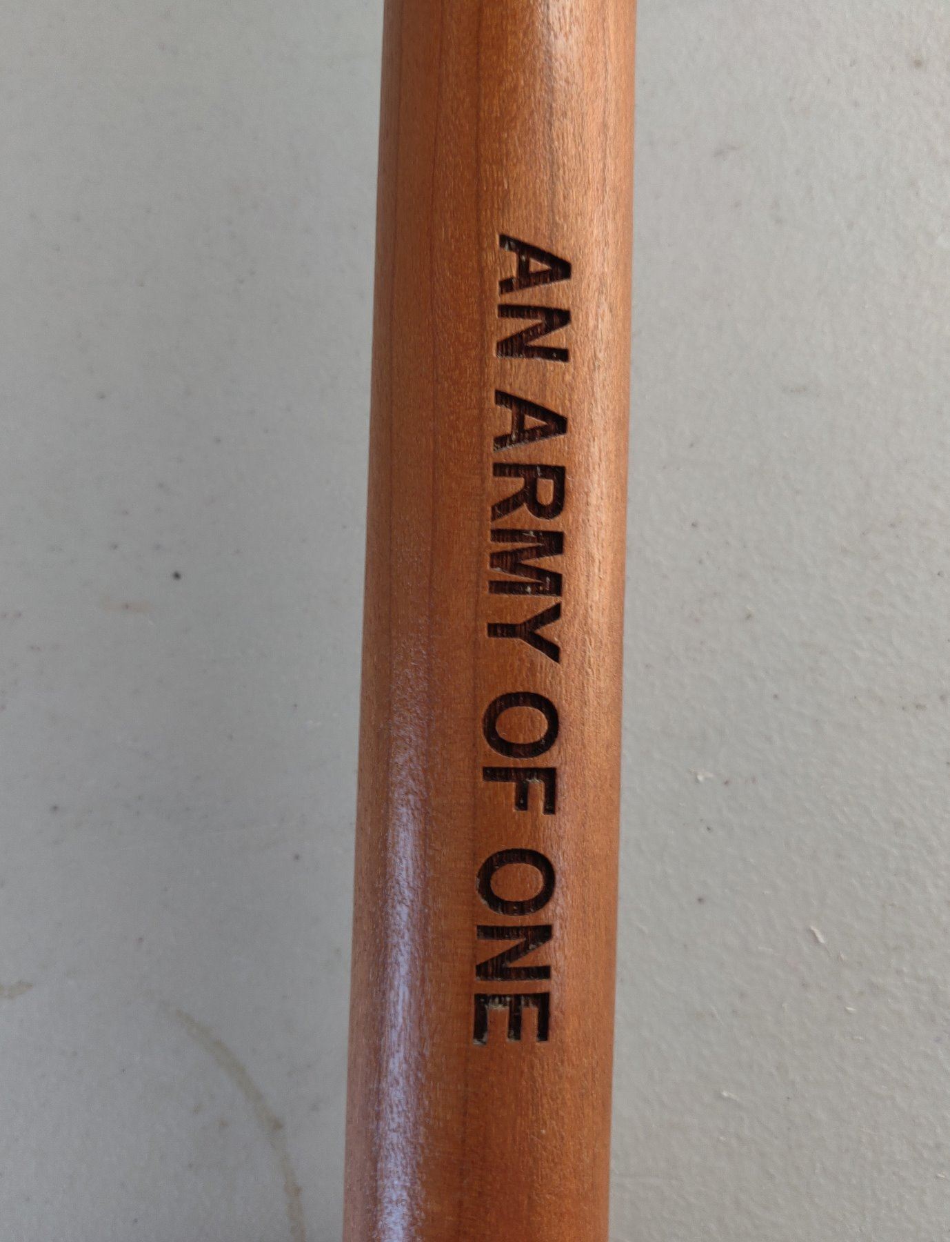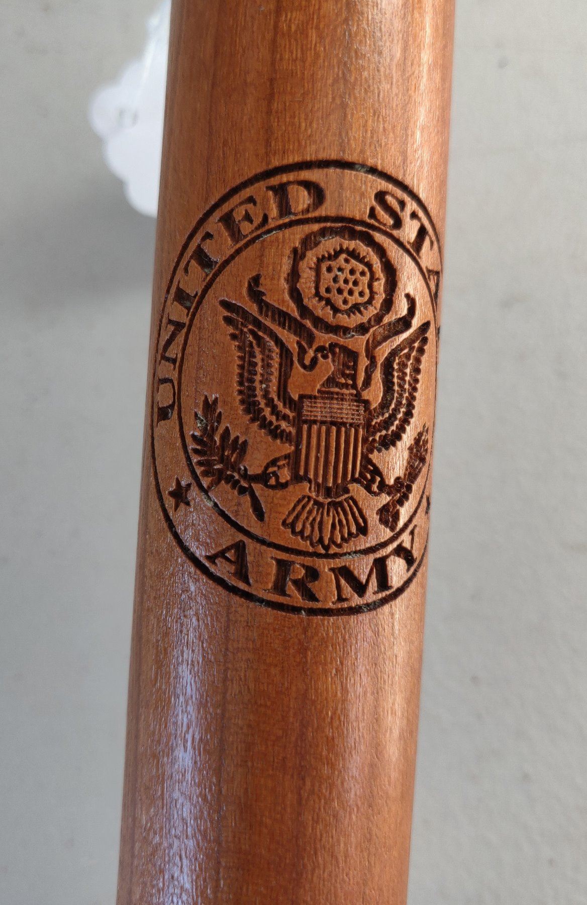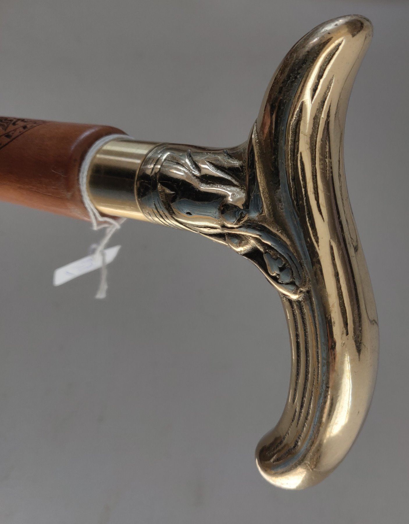 "Army of One" Cane, c. 2000s. Made of brass and wood, the item measures 36" x 5". USA, Olde Master. Bust of woman on handle. Condition: Some wear from use, see images. Shipping: $35.50 USA estimate only, w/insurance and signature, due to length and weight.