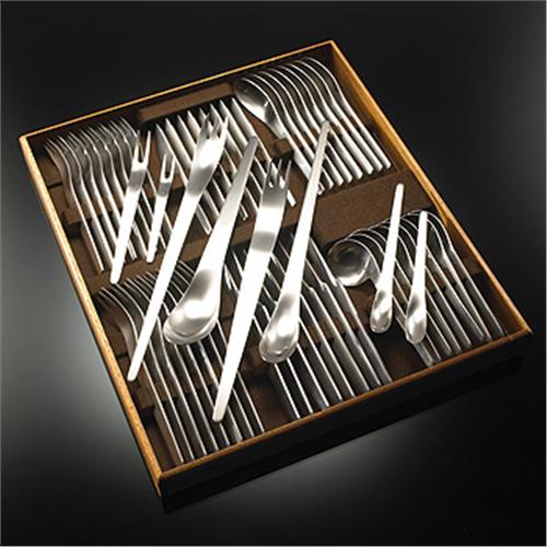Arne Jacobsen AJ flatware A. Michelsen Denmark, 1957 stainless steel Complete service for eight, plus one left-handed spoon, one ladle, two serving forks and four serving spoons, seventy-six pieces total. Sold with original wooden box. Impressed manufacturer's mark to each piece. Literature: Arne Jacobsen, Thau and Vindum, ppg. 146-147