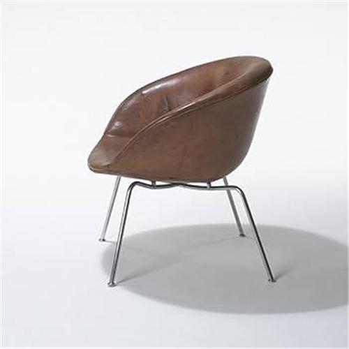 Arne Jacobsen Pot chair, model #3318 Fritz Hansen Denmark, 1959 leather, stainless steel 29 w x 24 d x 29.5 h inches Manufactured for only a short time, The Pot chair is one of Jacobsen's more minimal designs and illustrates the fundamental elements of his style. Literature:  Arne Jacobsen, Thau and Vindum, pg. 472