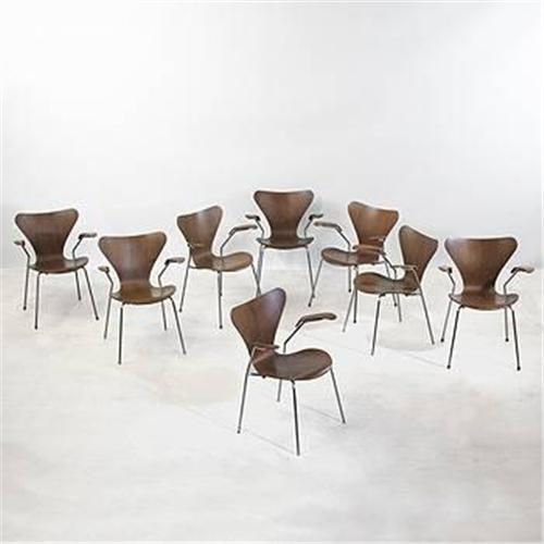 Arne Jacobsen<BR>Sevener chairs model #3207, set of eight<BR>Fritz Hansen<BR>Denmark, 1955<BR>teak plywood, chrome-plated steel<BR>23"w x 20"d x 29"h<BR>This form was displayed in the Danish pavilion, designed by Jacobsen, at the international H 55 exhibition in Helsingborg in 1955.<BR>Literature: Fritz Hansen catalog, 1963, pg. 12<BR>Arne Jacobsen, Thau and Vindum, pg. 395<BR><BR><BR>