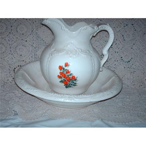 Pitcher and Wash Bowl made by Arnel is a beautiful white with red roses. Marked Arnel and the pitcher measures 11 inches high from bottom to top of spout and the bowl is 15 inches across. This pitcher and wash bowl is in good condition with 3 tiny nicks on the underneath side of bowl and 1 chip on top of the pitcher but can only detect it by feeling. Does not take away from the beauty of the set.