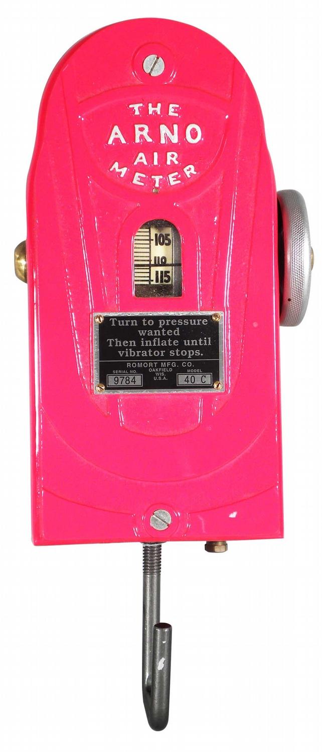 The Arno Air Meter, Romort Mfg Co. Oakfield, WI. Tire inflator. Excellent restored condition. 7 X 17 X 4 1/2 inches.