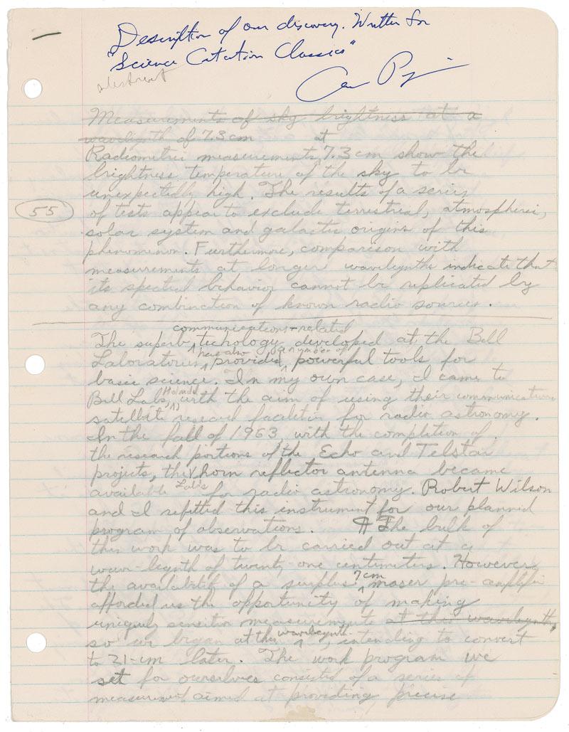 American physicist and Nobel laureate in physics. He and his colleague, Robert Woodrow Wilson, discovered cosmic microwave background radiation (CMB), the radio remnant of the "Big Bang," the theory of the origin of the universe. The two scientists were awarded the Nobel Prize in Physics in 1978. Unsigned handwritten manuscript, in pencil, four pages on both sides of two sheets of lined 8.5 x 11 loose-leaf sheets. Signed at the top of the first page, “Description of our discovery. Written for Science Citation Classics. Arno Penzias.” In fine condition, with some light soiling, and staple to top left corner. RRAuction COA.