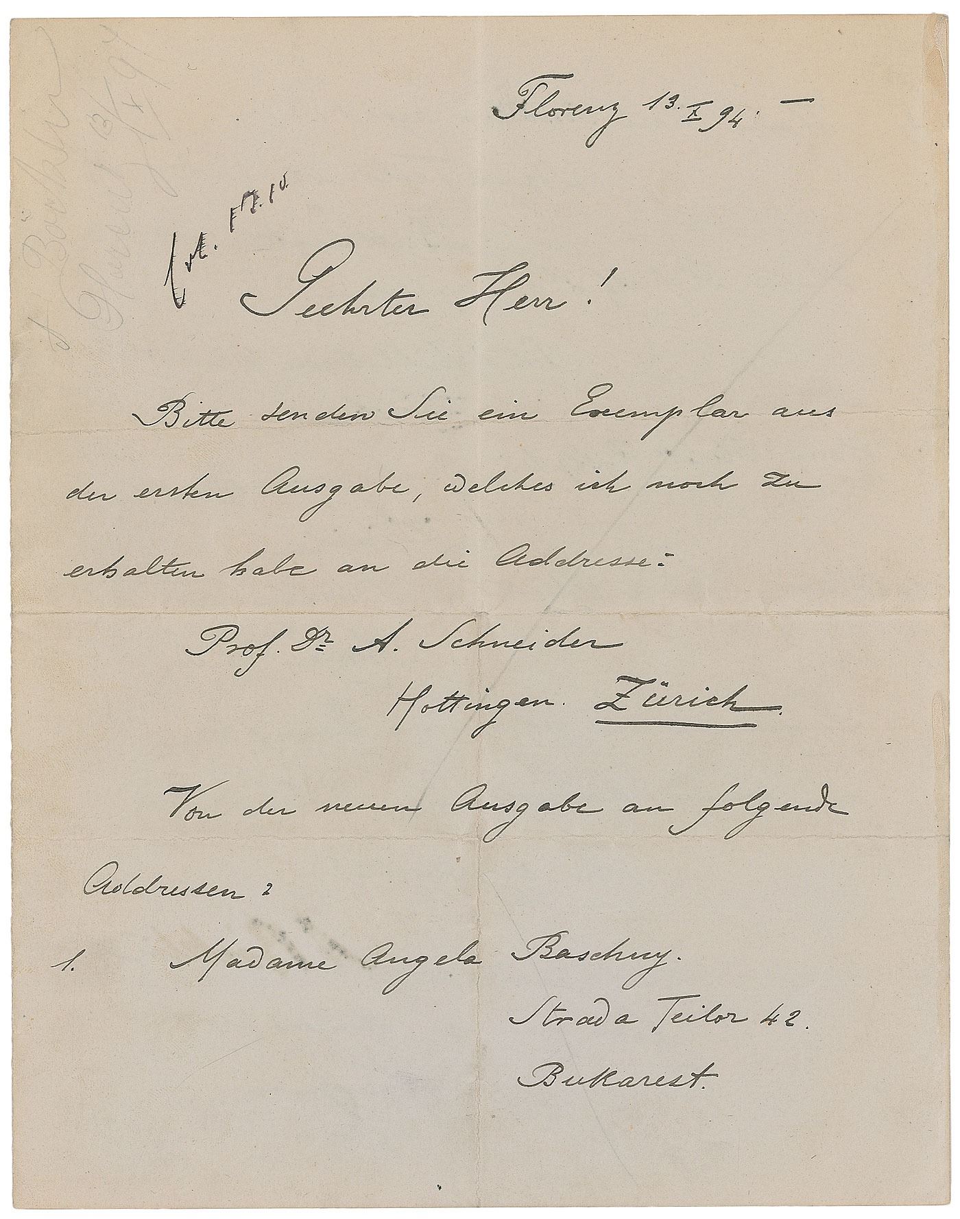Swiss symbolist painter (1827-1901) known best for his masterwork 'Isle of the Dead.' ALS in German, signed "A. Bocklin," one page both sides, 6.75 x 8.75, October 13, 1894. Untranslated letter to a friend whom he gives the addresses of five family members and friends for mailing a book or a catalogue of works. Intersecting folds, erased pencil notations, a light box of uniform toning from previous display, and a few slight bends to corners, otherwise fine condition.