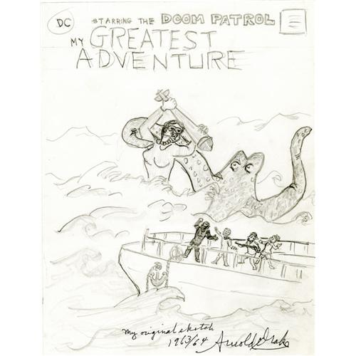 <B>Arnold Drake - My Greatest Adventure #81 Cover Rough Original Art (DC, 1963).</B></I> Before Bruno Premiani drew the original art for the cover to My Greatest Adventure #81, writer Arnold Drake created this pencil rough as artistic direction for Premiani. Comparing this pencil rough with the finished cover shows that Premiani followed Drake's example very faithfully! Signed and dated by Drake at the bottom, the piece measures 8.5" x 11" and is in Excellent condition.
