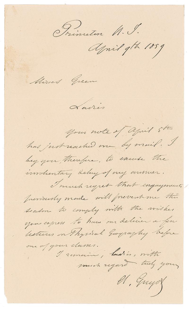 Swiss-American geologist and geographer (1807–1884) and the namesake of several geological features in the United States. LS signed “A. Guyot,” one page, 4.75 x 8, April 9, 1859. Guyot declines a lecture invitation. In part: “I much regret that engagements previously made will prevent me this season to comply with the wishes you express to have me deliver a few lectures on Physical Geography before one of your classes.” In fine condition, with some staining along the upper left side and a small lower left corner chip.