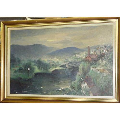 A large Oil Painting, 48 1/2" X 33", framed size. A landscape of mountains and a village with a river in the foreground. The painting is signed in the lower right hand corner, Arnold Hoffmann 41, Hoffmann was born in 1886 and died in 1966, he lived and worked in New Jersey. There are several spots on the canvas that the paint has chipped off. (15)
