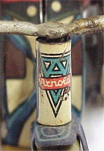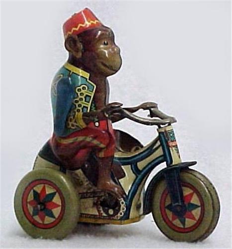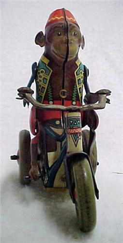 Arnold Monkey Bobby Cyclist; tin lithographed wind-up toy; D.R Patent ANG. D.R.G.M. Made in Germany US Zone; 4"high; no winding key, minor paint wear, has both ears;