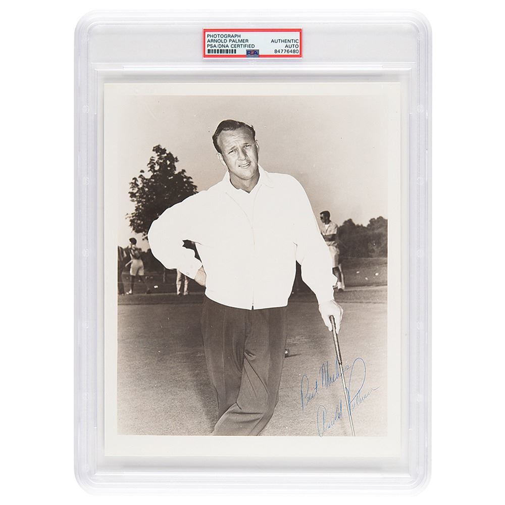 Vintage glossy 8 x 10 photo of a young Arnold Palmer leaning on a golf club, signed in blue ballpoint, "Best wishes, Arnold Palmer." In fine condition, with scattered small creases. Encapsulated in a PSA/DNA authentication holder.