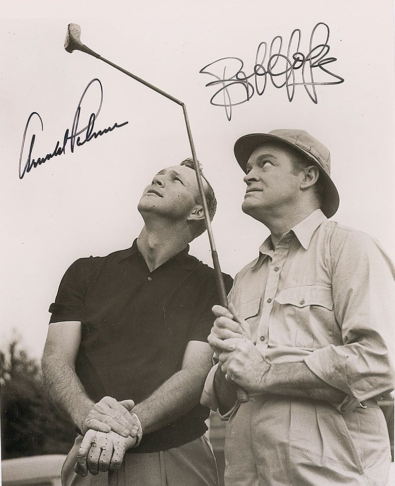 Humorous glossy 7.5 x 9 photo of Palmer and Hope in the middle of a round of golf, signed in black felt tip by both Palmer and Hope. In fine condition, with slightly trimmed edges.