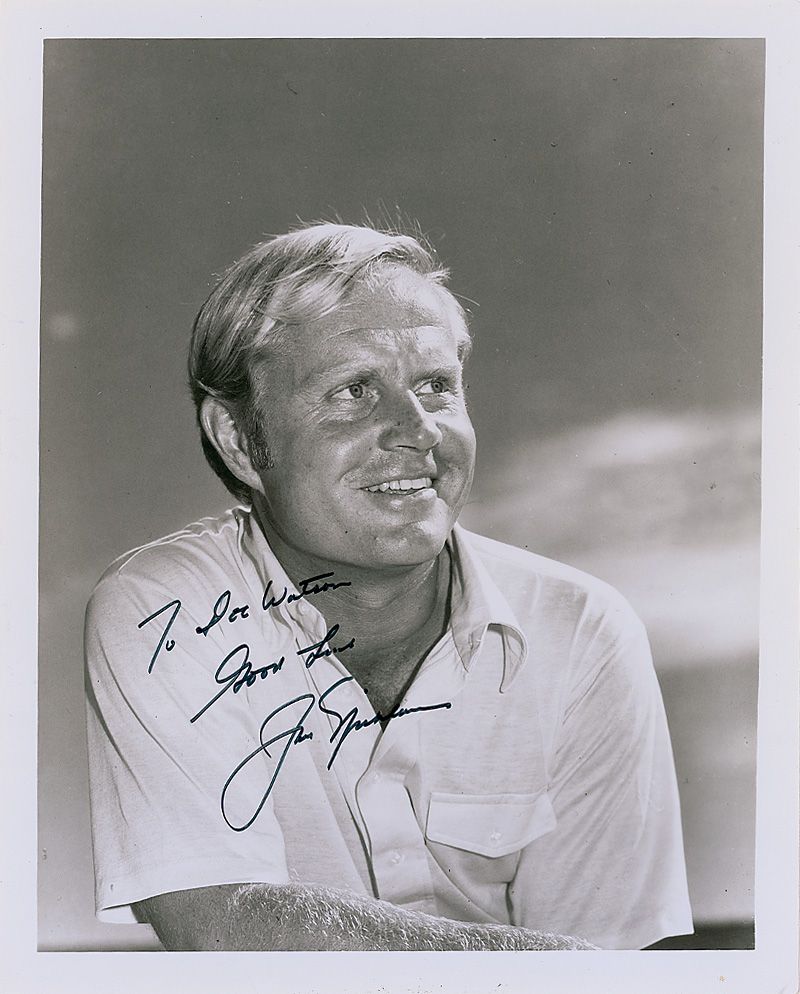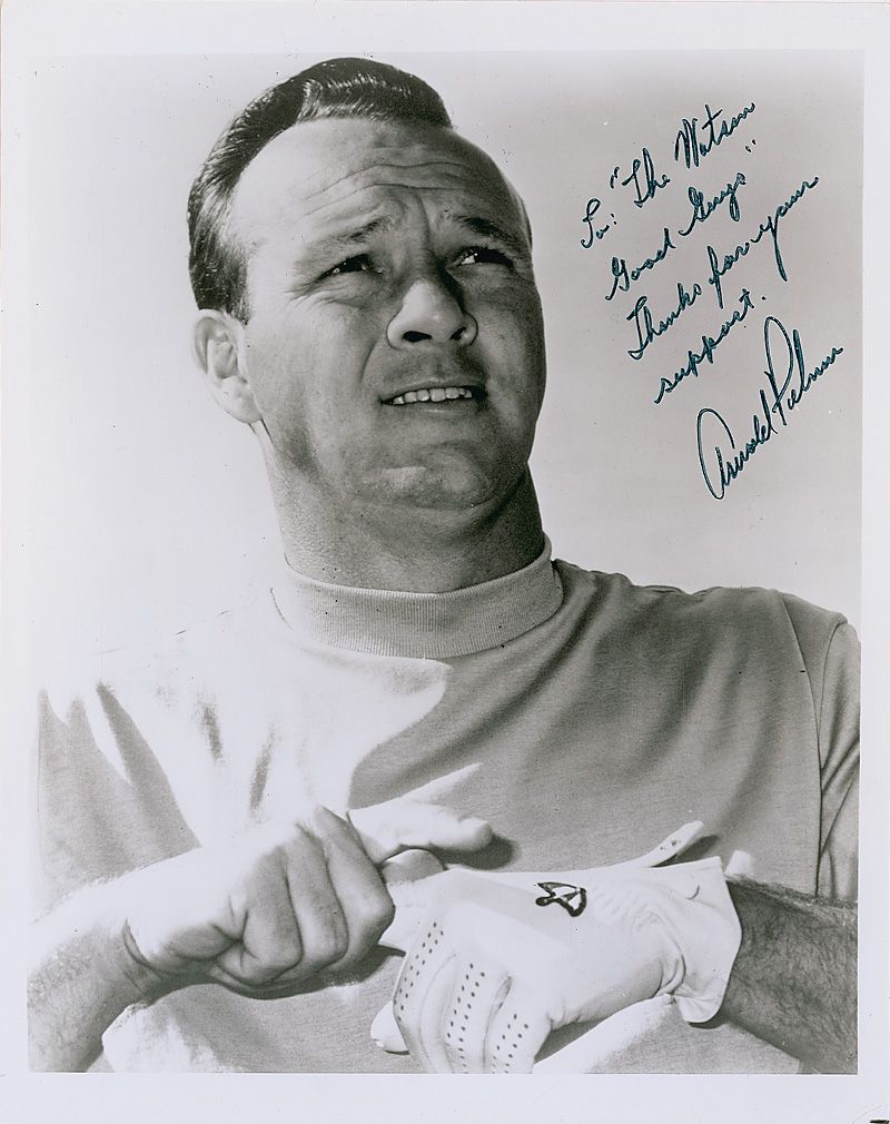 Two vintage glossy 8 x 10 photos, one of Palmer signed and inscribed in black felt tip, “For ‘The Watson Good Guys’ Thanks for your support. Arnold Palmer”; and one of Nicklaus, signed and inscribed in black felt tip, “To Doc Watson, Good luck, Jack Nicklaus.” In very good condition, with scattered creases, dings, and surface marks, and a small tear to top edge of Palmer’s photo.