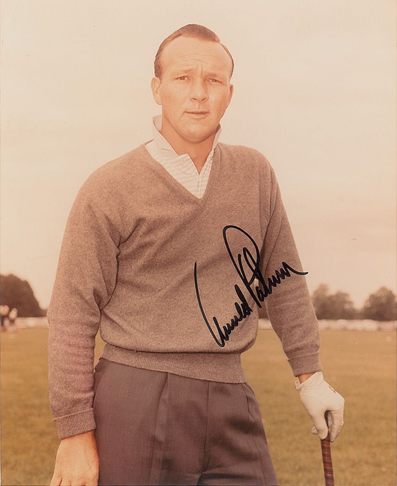 Color glossy 8 x 10 photo of Palmer posing on the course, signed in black felt tip. In fine condition, with a few trivial dings to top.