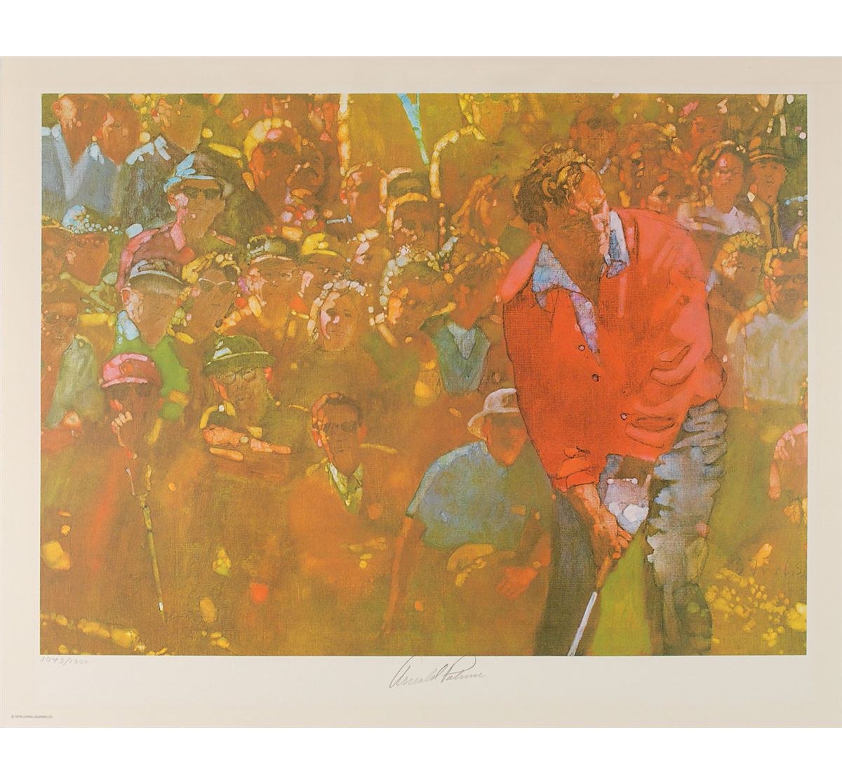 Color limited edition 22 x 18 print of a creative depiction of Palmer putting, numbered 1043/1500, signed in the lower border in pencil. In fine condition, with show-through at the top edge from a mounting strip affixed to the reverse. These difficult-to-find prints were issued in the 1970s by Sports Illustrated.