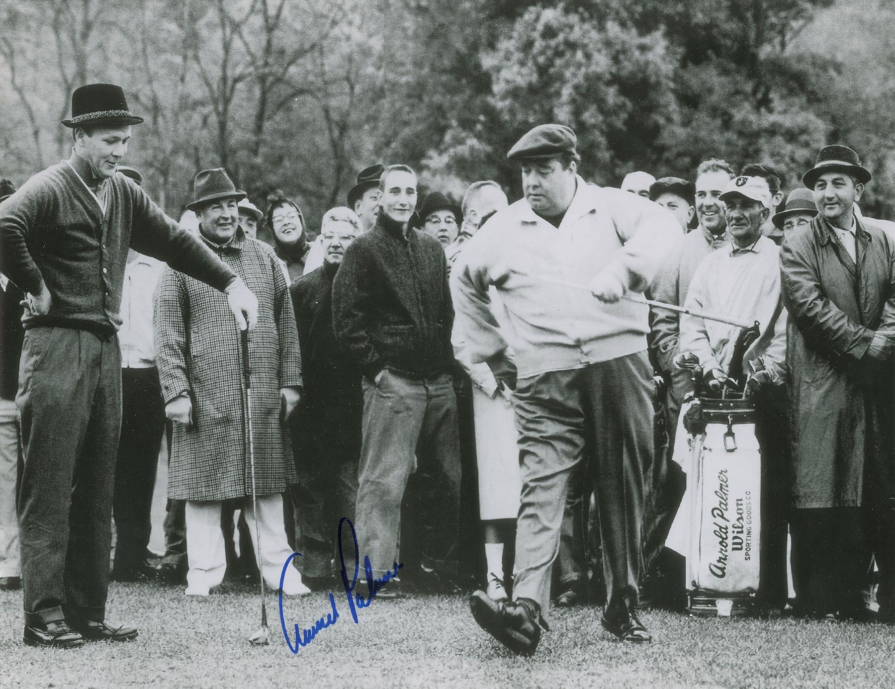 Glossy 14 x 11 photo of Arnold Palmer golfing with Jackie Gleason, signed in blue felt tip by Palmer. In very good to fine condition, with some creasing to middle of the image. Originally obtained by in-person specialist Mike Wehrmann.