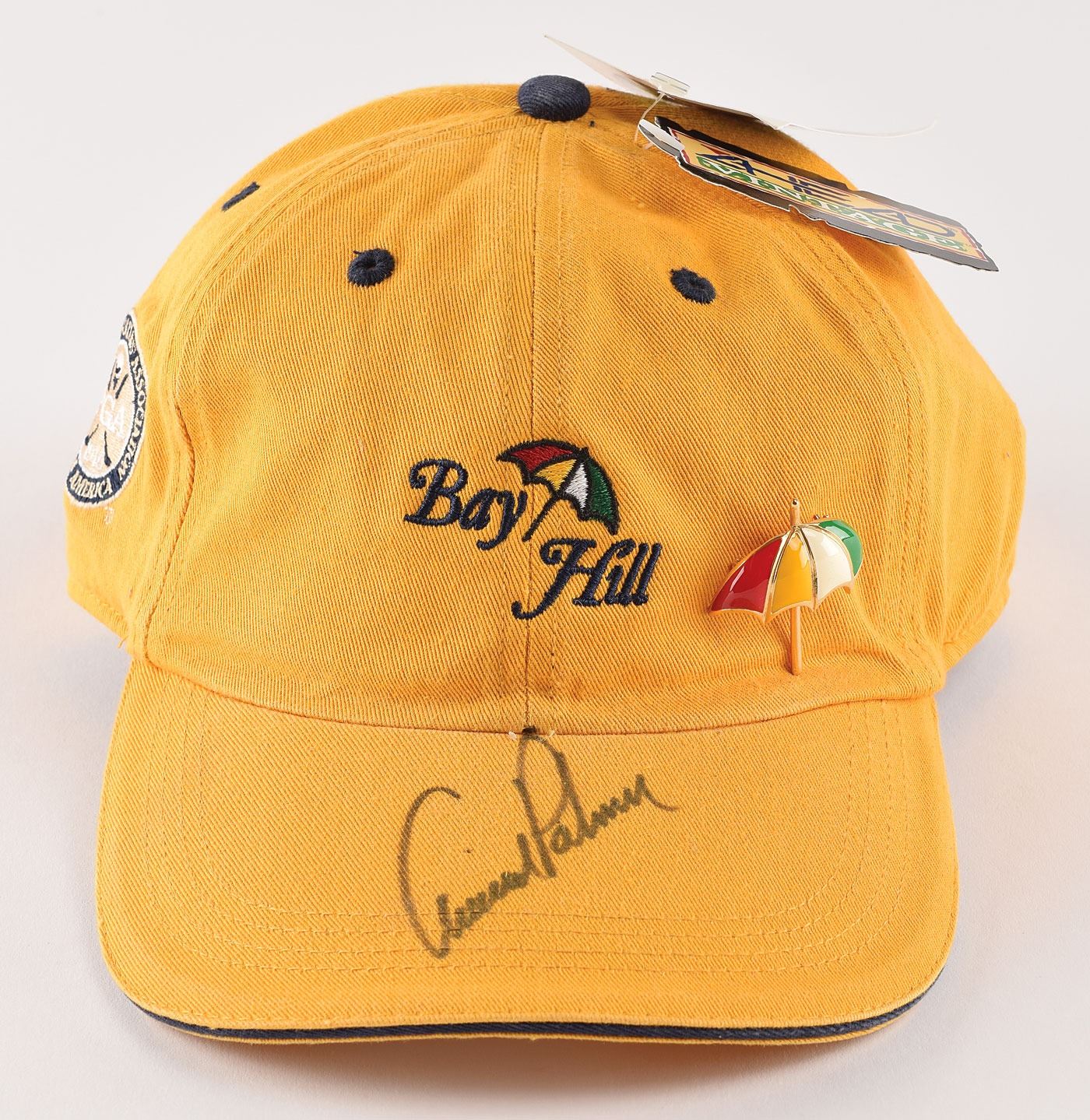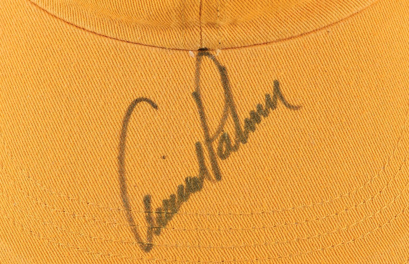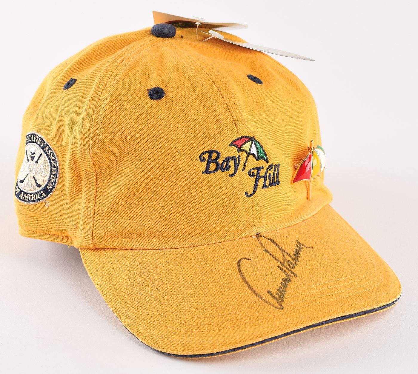 Very desirable burnt yellow Bay Hill Club and Lodge cap with adjustable strap and umbrella pin, signed on the brim in black felt tip by Arnold Palmer. In fine condition.