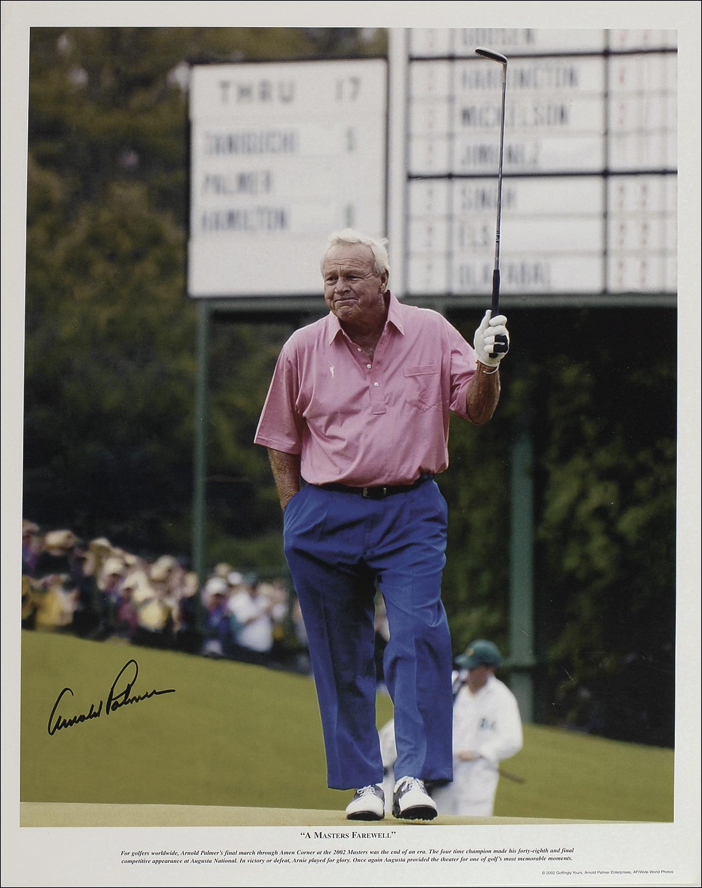 Color 17.5 x 22.25 print entitled A Master’s Farewell, showing Palmer acknowledging the crowd at Amen Corner during his final competitive round at Augusta, signed in black felt tip. Rolled and in fine condition, with some scattered light creases. Pre-certified Steve Grad/PSA/DNA and RRAuction COA.