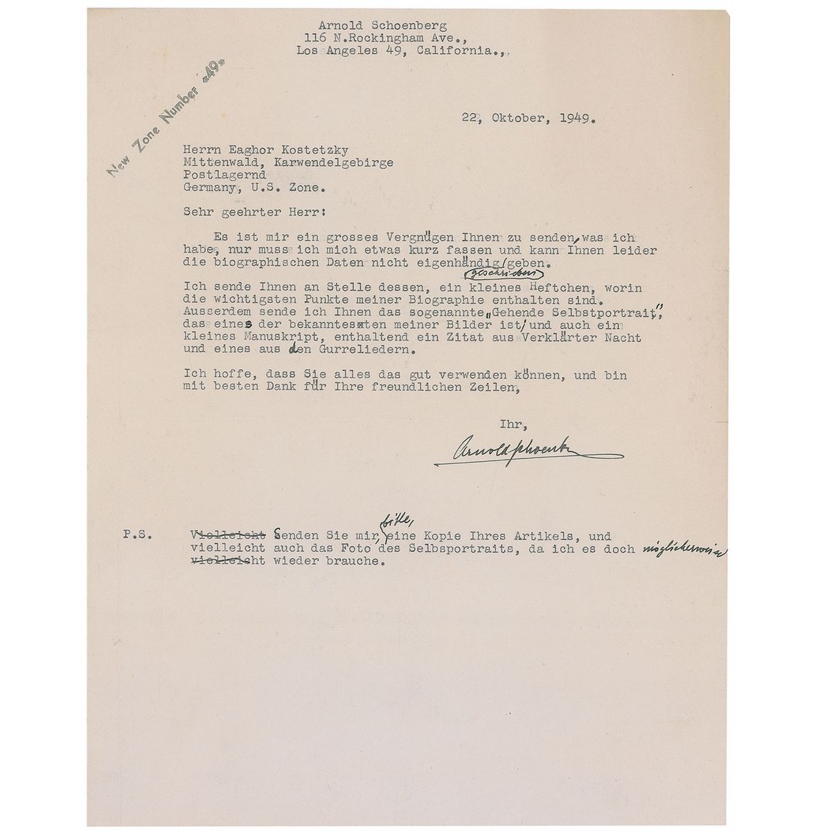 Austrian-born composer (1874–1951) whose development of the twelve-tone system proved to be one of the most far-reaching innovations in the history of twentieth-century music. TLS in German, one page, 8.5 x 10.75, October 22, 1949. Nice letter to Eaghor Kostetzky. In part (translated): “I am sending you a small brochure where you can find the most important things on my biography. Moreover I am sending you the so-called ‘Gehende Selbsportrait,’ which is one of my rather known portraits, and a small manuscript including a quote of music of ‘Verklarter Nacht’ and one of my ‘Gurrelieder.’” In fine condition, with intersecting folds and light creases. An especially desirable letter as he references two of his great works. ‘Verklarte Nacht [Transfigured Night],’ a string sextet, was composed by him over the course of three weeks in 1899 and is considered his earliest important work. ‘Gurrelieder’ is a massive cantata for five vocal soloists, narrator, chorus, and large orchestra, composed over the course of a decade from 1900 to 1911.