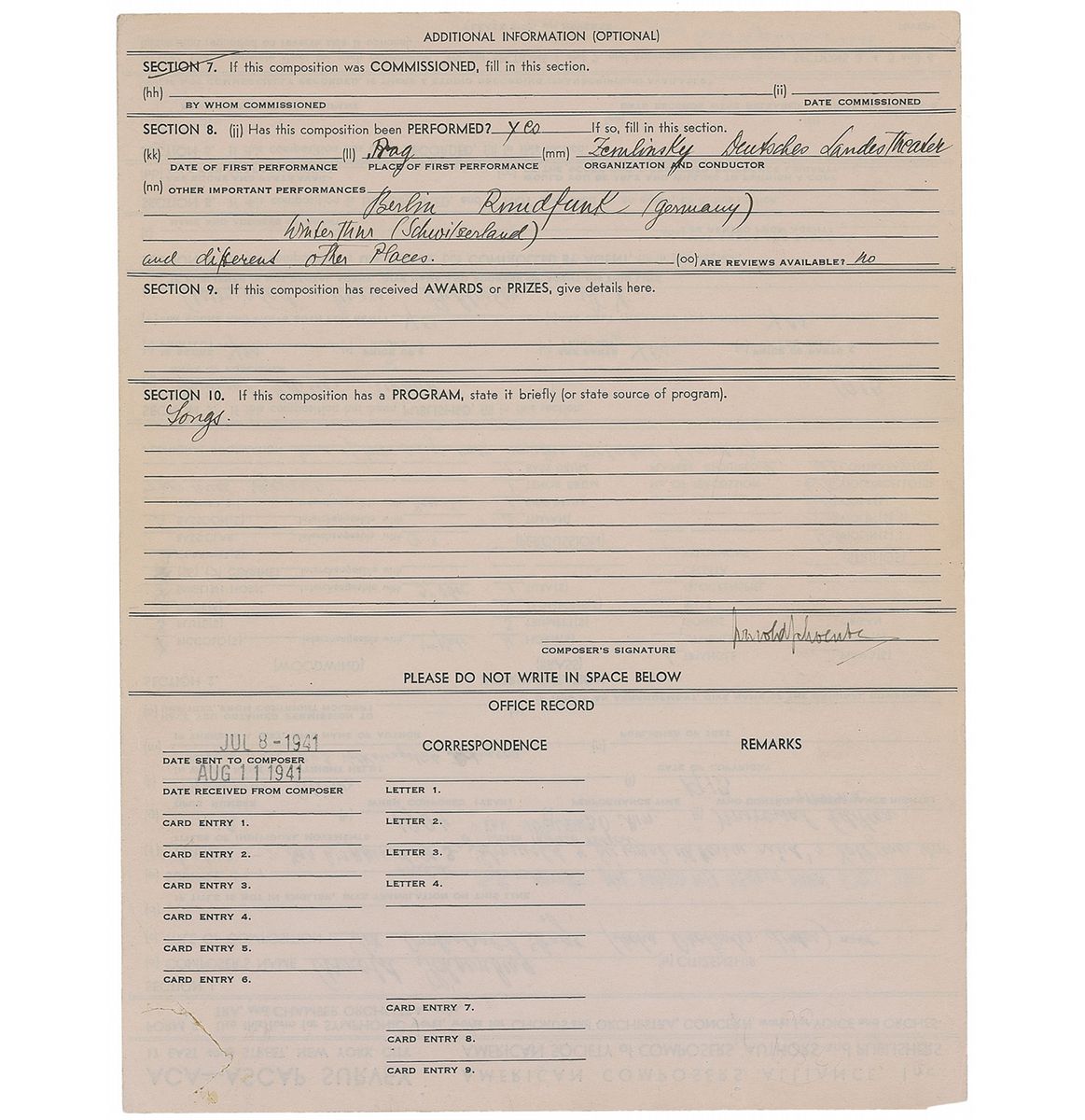 Austrian-born composer (1874–1951) whose development of the twelve-tone system proved to be one of the most far-reaching innovations in the history of 20th-century music. DS, one page both sides, 8.5 x 11, August 11, 1941. An American Composers Alliance/ASCAP questionnaire filled out in another hand with detailed information on Schonberg’s composition ‘Six Orchestral Songs,’ listing the German titles of the songs: “1. Natur, 2. Das Wappenschild, 3. Sehnsucht, 4. Nie ward ich, Herrin mud, 5. Voll jener Susse, 6. Wenn Voglein klage.” The document goes on to provide information on the instrumentation necessary for performance, the publishing firm used, and past concert dates. Signed at the conclusion in fountain pen by Schonberg. In fine condition, with expected document wear and tape remnants to two corners.