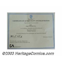 Arnold Schwarzenegger - Screen-Used Prop from "Eraser". Offered here is the military-issue commando-style parachute and weapons vest worn by Schwarzenegger's character Krueger in the blockbuster film "Eraser". This highly identifiable prop/costume can be seen clearly in the film. The artifact itself is an incredibly expensive, and seldom seen, piece of military equipment given only to the most experienced and talented special forces members. This original piece of equipment has been customized by the special effects and wardrobe team on the film, and has been given a non-working, decommissioned status. A letter of authenticity from Warner Brothers is included with this lot. Cataloged and guaranteed by Startifacts. Important notice: Heritage usually auctions material at the rate of 200-250 lots per hour. On some occasions eBay Live bid software or the Internet may not be able to keep up with the pace of the auction. We recommend placing a realistic absentee bid now as insurance to avoid disappointment. Occasionally the auctioneer may eliminate or reject an eBay Live bid, and the auctioneer may also reopen a lot after the close of the eBay live bidding (usually because we missed an audience bid), and may reject your bid even if it shows you as the winning bidder. By bidding via eBay Live, you agree that Heritage may award the lot to another bidder at its sole discretion under the circumstances described above or any other reasonable circumstances. Also please note that all Heritage lots purchased through eBay Live carry a 20% Buyer's Premium. Please make sure you read the Terms and Conditions before you bid.