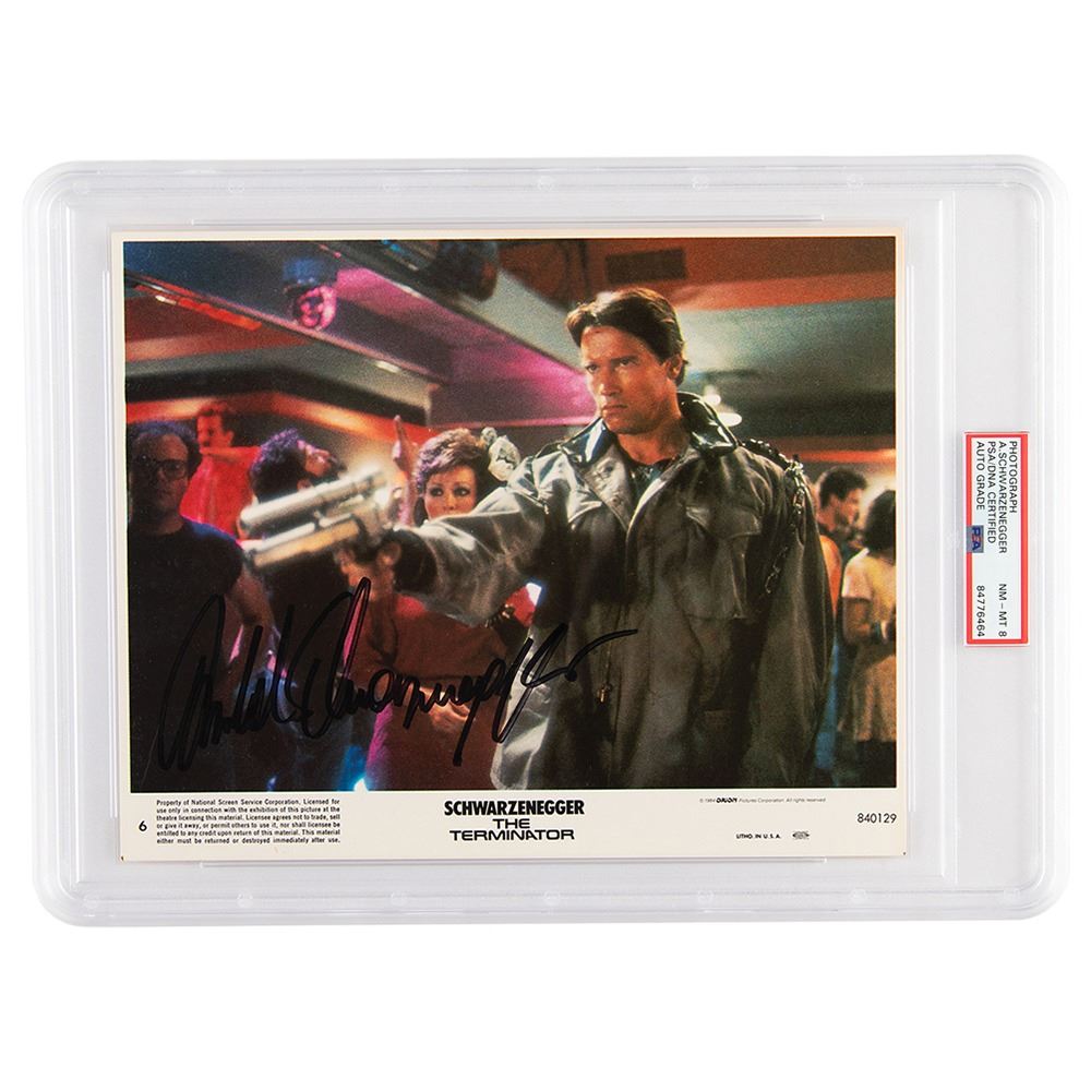 Color semi-glossy 10 x 8 Orion Pictures publicity of Arnold Schwarzenegger as the deadly title character from James Cameron& #39;s classic 1984 science fiction action film The Terminator, signed in black felt tip by Schwarzenegger. In fine condition. Encapsulated and graded by PSA/DNA as "NM-MT 8."