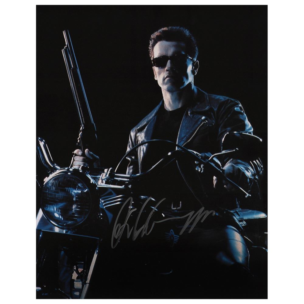 Color satin-finish 11 x 14 photo of Arnold Schwarzenegger from the Oscar-winning 1992 action film Terminator 2: Judgment Day, signed in silver ink. In fine condition.