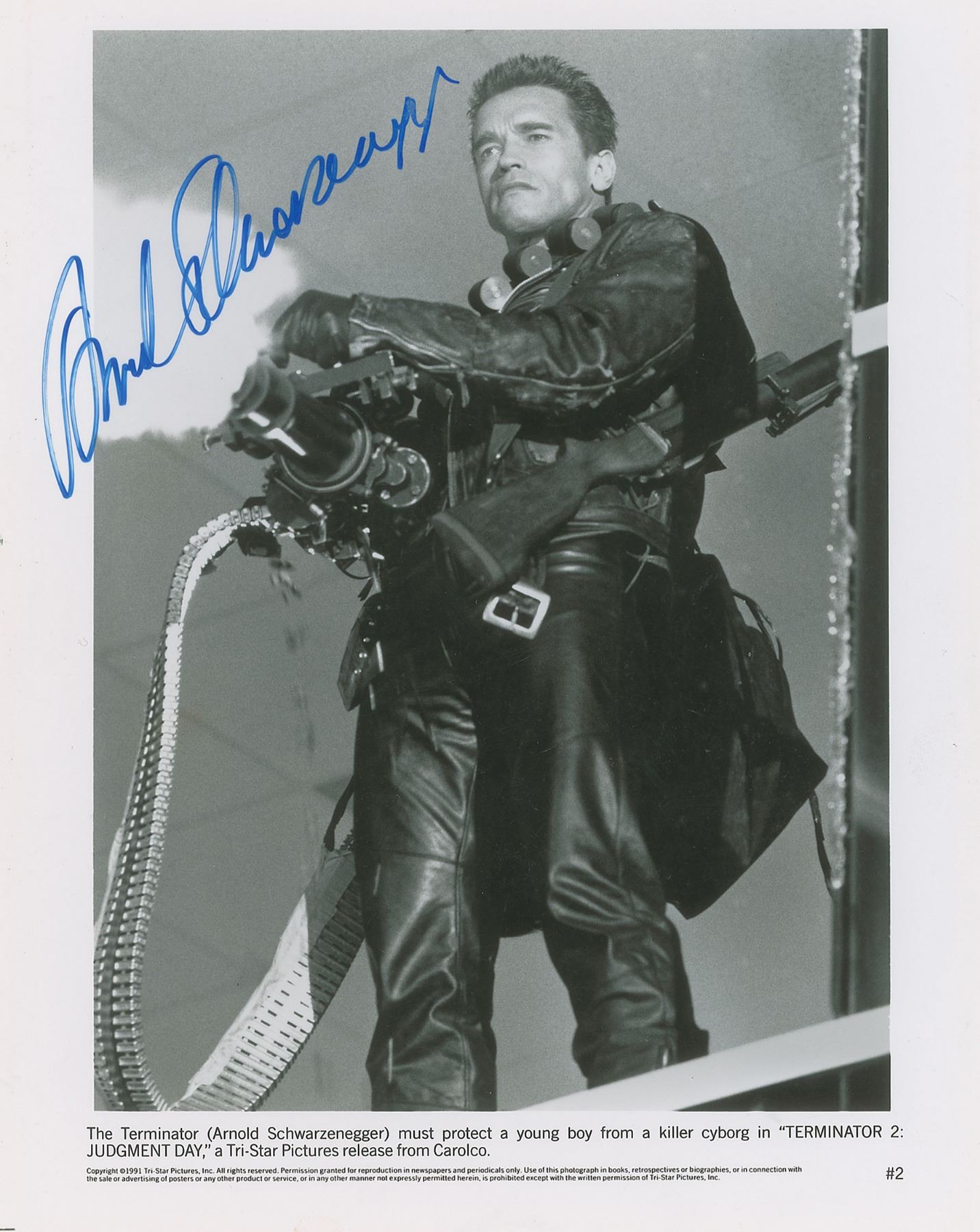 Awesome glossy 8 x 10 Tri-Star Pictures publicity photo of Schwarzenegger as the bodyguard cyborg in the action masterpiece Terminator 2: Judgment Day, signed in blue felt tip. In fine condition.