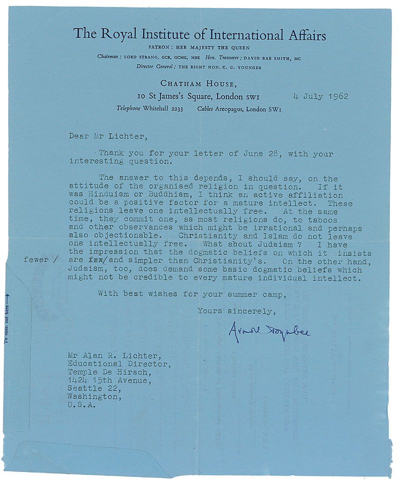 TLS, one page on a 7.75 x 9.25 self-contained Air Mail letter, The Royal Institute of International Affairs letterhead, July 4, 1962. Letter to Mr. Lichter responding to an “interesting question,” in part: “The answer to this depends, I should say, on the attitude of the organised religion in question. If it was Hinduism or Buddhism, I think an active affiliation could be a positive factor for a mature intellect. These religions leave one intellectually free. At the same time, they commit one, as most religions do, to taboos and other observances which might be irrational and perhaps also objectionable. Christianity and Islam do not leave one intellectually free. What about Judaism? I have the impression that the dogmatic beliefs on which it insists are fewer and simpler than Christianity’s. On the other hand, Judaism, too, does demand some basic dogmatic beliefs which might not be credible to every mature individual intellect.” Stamped and addressed on the reverse in type. In fine condition, with scattered creases and expected tears to edges from opening.