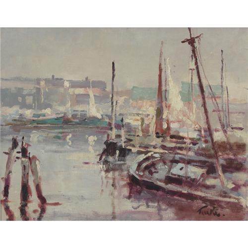 Arnold Turtle (American,20th century), Gloucester Harbor, c.1930; oil/canvasboard,16in. x 20in., signed.Turtle worked in Chicago, and specialized in impressionist views and figure paintings.