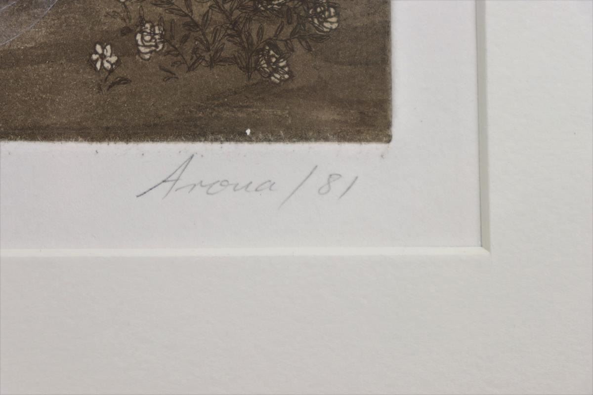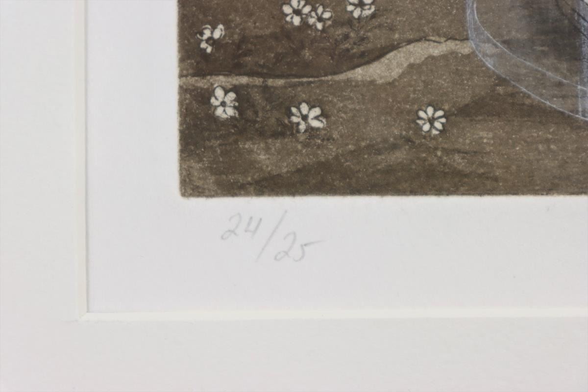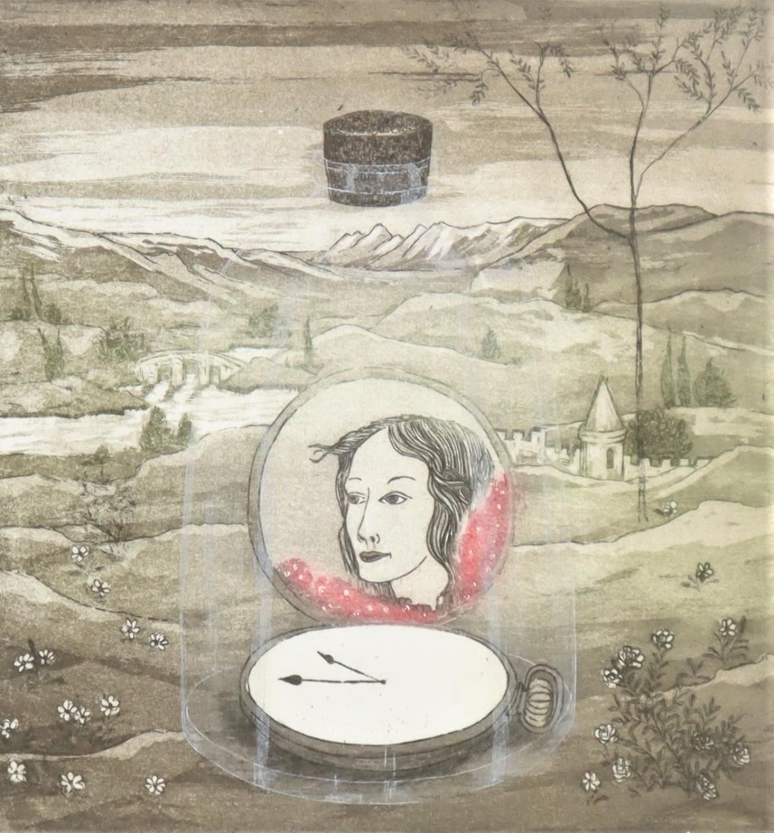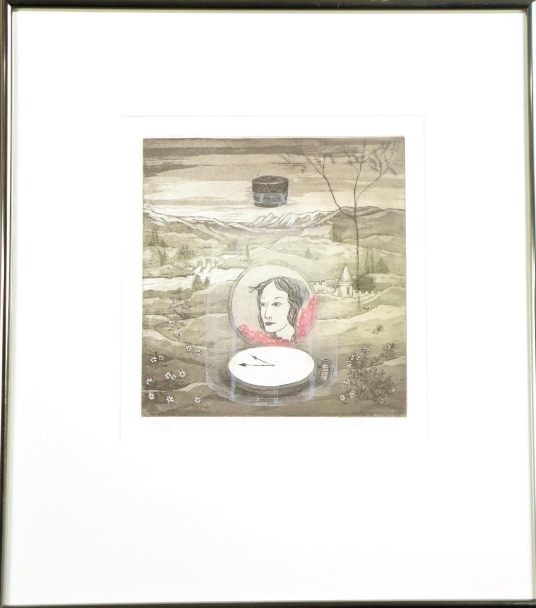 Titled "Bell Jar", lithograph numbered 24/25, surreal landscape with a timepiece. Signed and dated in margin: Arona/81.