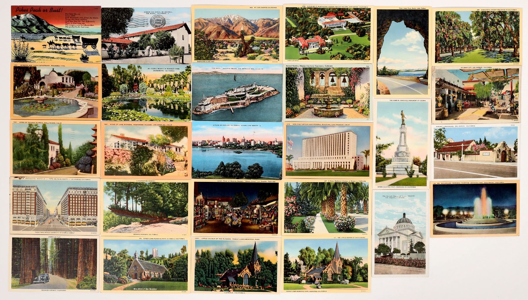 lot of 24. Collection covering both North and South Calif. Postmarks : Richmond, Sacramento, San Fran., Reseda, L.A. I.E.; Skyline of Oakland, gardens in Sacto, Alcatraz, Mission San Juan Capistrano, San Marino, Hollywood, Roslyn Hotel L.A., Redwood Hiway, Olivera St L.A., Monument in Coloma, Cave Rock Lake Tahoe. California 1930-45 Ken Prag Collection