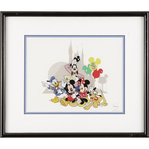 <B>"Around the 'World' With the Fabulous Five" Limited Edition Sericel (Disney, 1996).</B></I> Mickey Mouse, Minnie Mouse, Donald Duck, Goofy, and Pluto head to Florida to enjoy the 25th anniversary of Walt Disney World, in this sericel from a limited edition of 5000. The sericel measures 12" x 9" and is matted and framed. In Excellent condition. Includes a certificate of authenticity. <BR><BR><B>Important notice:</B> Heritage usually auctions material at the rate of 200-250 lots per hour. On some occasions eBay Live bid software or the Internet may not be able to keep up with the pace of the auction. We recommend placing a realistic absentee bid now as insurance to avoid disappointment. Occasionally the auctioneer may eliminate or reject an eBay Live bid, and the auctioneer may also reopen a lot after the close of the eBay live bidding (usually because we missed an audience bid), and may reject your bid even if it shows you as the winning bidder. By bidding via eBay Live, you agree that Heritage may award the lot to another bidder at its sole discretion under the circumstances described above or any other reasonable circumstances. Since eBay bids are not shown to us until we open the lot on the floor, we treat those bids just like floor bids. In most cases the floor responds before the eBay bid is presented to us, due to Internet lag time, so for consistency we have made it a policy that floor bids are always considered first over tie eBay live bids. Also please note that all Heritage lots purchased through eBay Live carry a 22.5% Buyer's Premium. Please make sure you read the Terms and Conditions before you bid. This lot is being auctioned in conjunction with a live floor auction by Heritage Auction Galleries. All final auction and invoice information will be supplied by Heritage Auction Galleries, and all other information should be considered preliminary. Lot:41001 <BR><BR><B>Winning Notification and Billing:</B> After the FINAL session in this auction is complete, Heritage will send e-mail and snail mail invoices. This process normally takes several days. All final auction and invoice information will be supplied by Heritage Auction Galleries, and all other information should be considered preliminary. <BR><BR>This auction will be conducted on a live auction floor and over the Internet through eBay Live. If you choose to place an absentee bid, please take a moment to <font color='#0000ff'><u><a href='http://pages.ebay.com/liveauctions/help/before/laabsentee.html'>learn how eBay Live absentee bidding works</a></u></font><font color='#000000'>