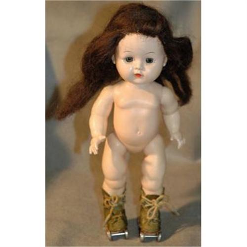 10" Arranbee's 1st Littlest Angel straight leg walker. She has roller skates but no clothes. When her legs go back and forth so does her head. She also has jointed arms and sleep eyes. She is unmarked. <p> The condition is good. I cleaned her up a little with soap and water but there are some areas on her legs that need more aggressive cleaning. The wig is lifting a little. Her hair is a bit matted . Plus she needs some clothes.